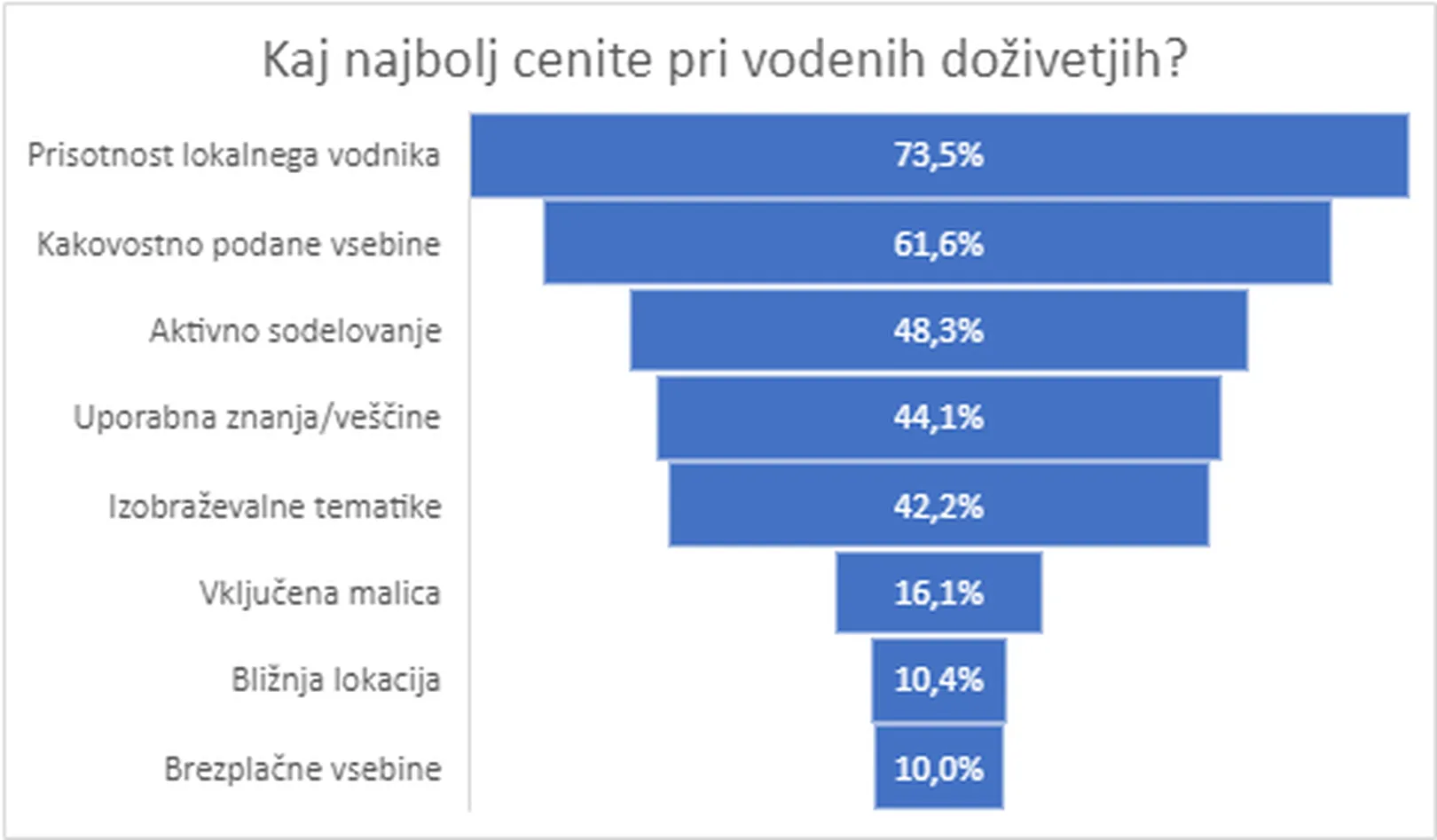 Po vsakem izvedenem doživetju smo udeležence s kratkim anketnim vprašalnikom zaprosili za oceno dogodka. Zanimalo nas je predvsem, kako zadovoljni so udeleženci z vodenim doživetjem ter kaj pri teh dogodkih najbolj cenijo, saj želimo še naprej zagotavljati kakovostna doživetja za naše obiskovalce.