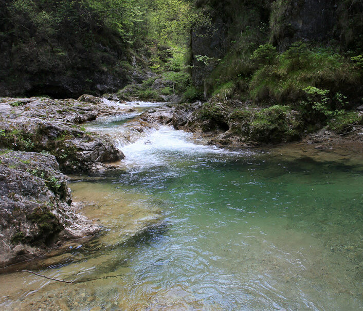Iška and Zala are mountainous watercourses whose tributaries have carved distinctive gorges in the dolomites and limestones. Zala originates on the western edge of the Vid plateau, and Iška on the northern side of the Bloke plateau near the settlement of Lužarji. Many smaller springs feed the Iška already in its middle course into a mightier stream, which flows through numerous rapids and cascades toward Vrbica, where it joins Zala. The watercourse, with the common name Iška, then runs through the Iški vintgar gorge toward Iška vas village and on toward the Ljubljana Marshes.