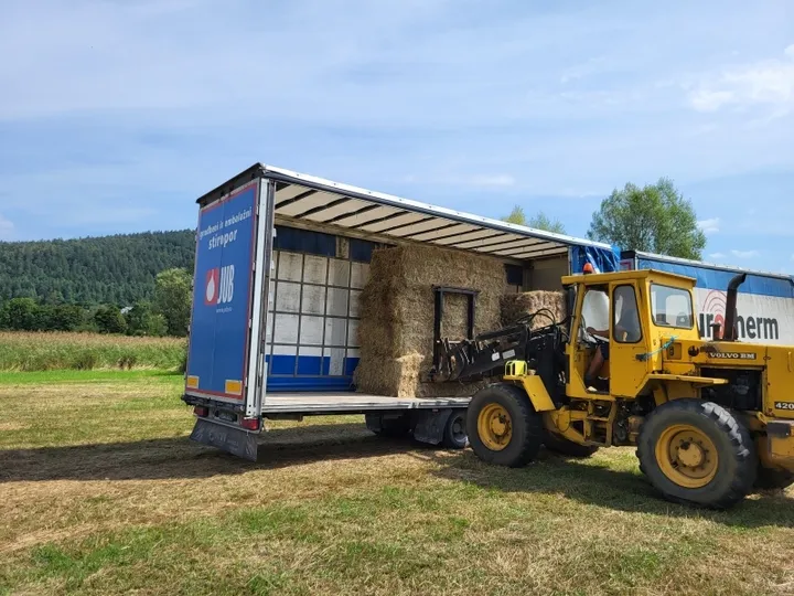 Velik kup bal sena, zložen v pravokotni obliki na travnatem polju. Ob njem stoji rumen traktor s čelno nakladalko, ki premika ali nalaga bale. V ozadju so griči, drevesa in delno oblačno nebo.