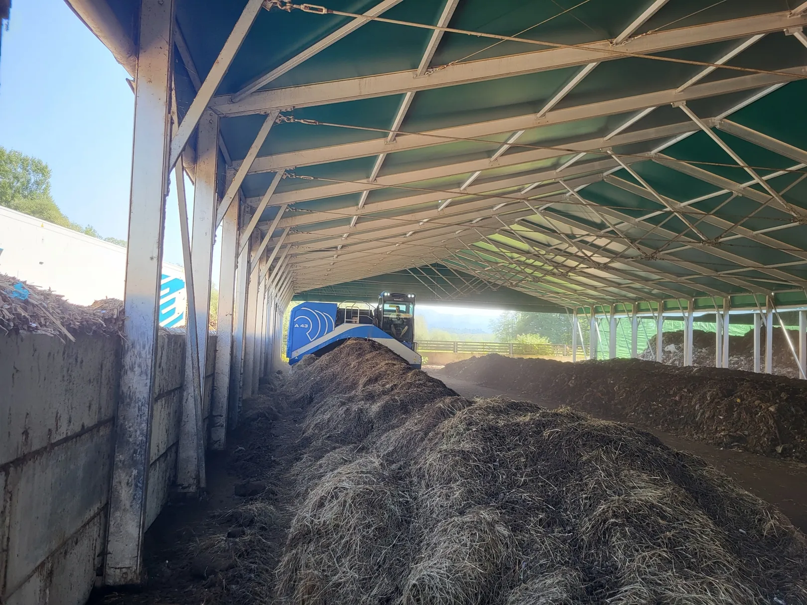 At the composting facility, the delivered bales were untied and the material was spread out under a covered area in the form of a long straight pile, about 1 m high and 2 m wide. Material containing bacteria was added to the biomass to accelerate the composting process. The mixture was mechanically turned for about 14 days and then transferred into closed basins, which are inaccessible due to strong odor and poor light. In these basins, a controlled composting process takes place, where maintaining optimal temperature and humidity is crucial for producing a high-quality final product.